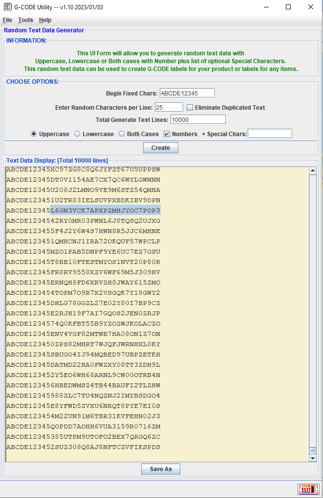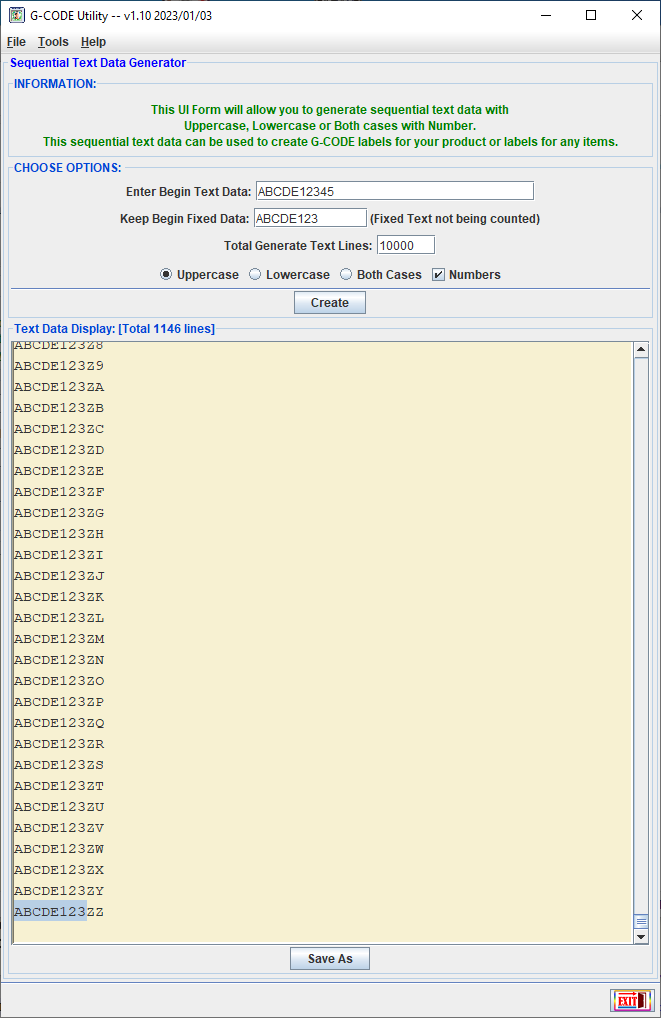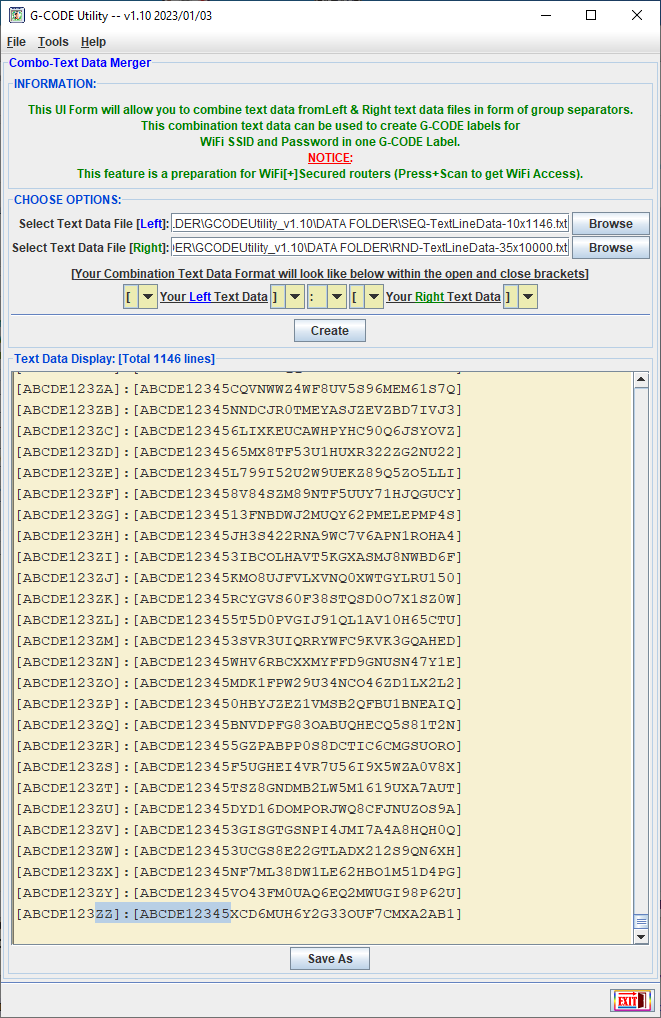5. Click 'Save_As' button and save the merged text data to a file and ready for the G-CODE Creator application to generate labels.